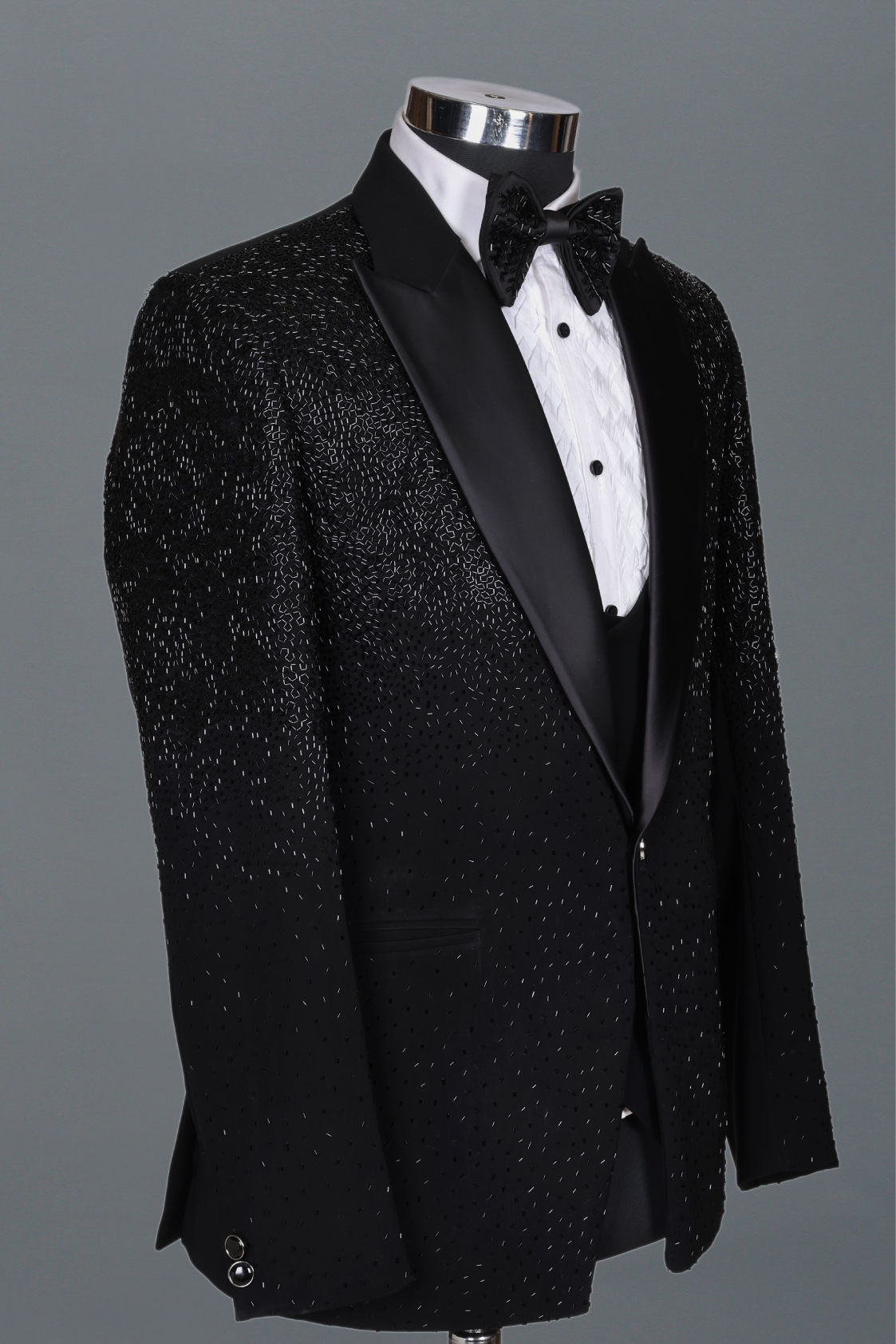 A statement tuxedo crafted in luxurious midnight blue velvet with subtle vertical textures and elegant embroidery on the shoulder and chest. The satin peak lapel, paired with a sharp white shirt and bow tie, creates a timeless black-tie look with a touch of modern glamour. Perfect for receptions, cocktails, and high-profile evenings.